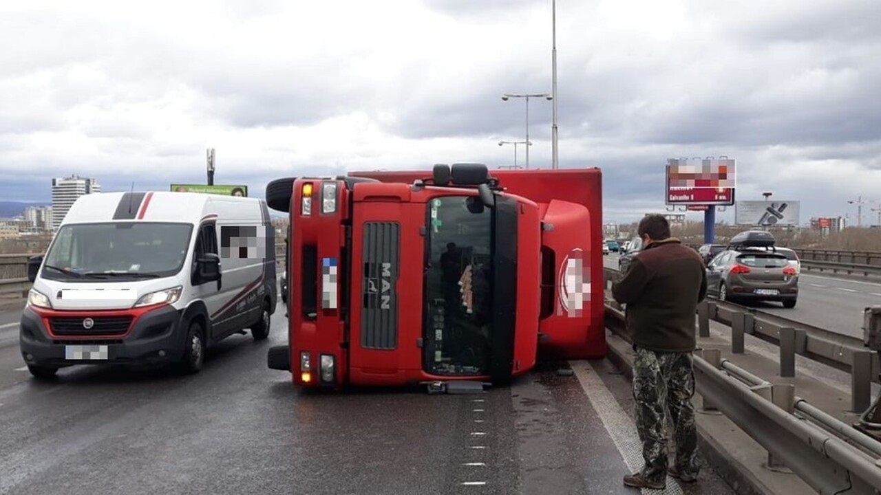 Premávka na Prístavnom moste v Bratislave v smere do Petržalky je čiastočne obmedzená, v dôsledku silného bočného vetra sa tam prevrátil kamión. Informuje o tom polícia na sociálnej sieti.