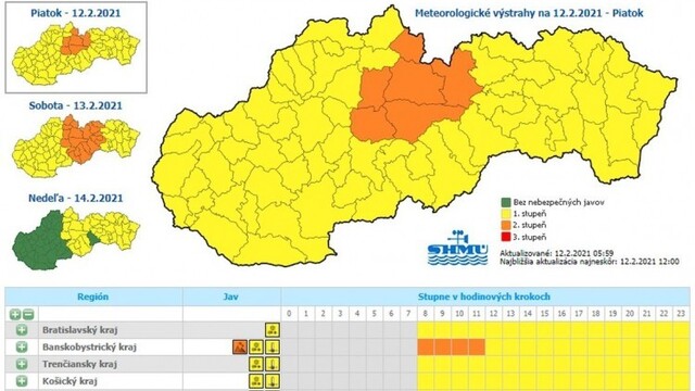 Teploty môžu podľa SHMÚ miestami dosiahnuť mínus 15 až mínus 20 stupňov Celzia. Ešte chladnejšie má byť v okresoch Brezno, Lučenec, Poltár, Rimavská Sobota, Rožňava, Revúca, Gelnica a Spišská Nová Ves, kde v sobotu ráno 13. 2. od 2.00 do 8.00 h platí výstraha druhého stupňa. Na riziko povodní upozorňuje SHMÚ pre oblasť dolnej časti povodia Bodrogu, a to v okrese Michalovce a Trebišov bez Roňavy.