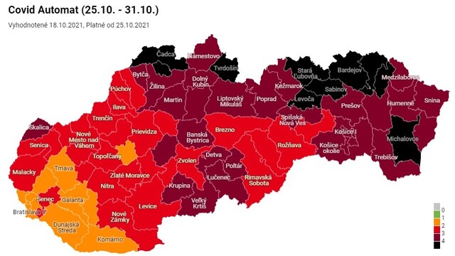 Od pondelka 25. októbra bude na Slovensku v čiernej farbe desať okresov. V druhom stupni ohrozenia, teda v bordovej fáze, bude 30 okresov. Červených okresov bude 27, oranžových 12. Vláda na svojom stredajšom rokovaní schválila v rámci Covid automatu rozdelenie okresov podľa aktuálnej rizikovosti.
