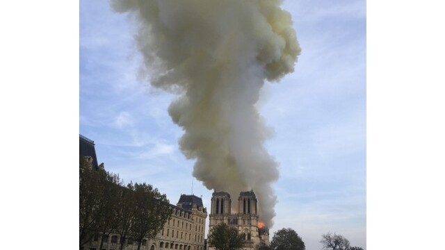 Zábery zverejnené v sociálnych sieťach zachytávajú plamene a veľké kúdoly dymu, vychádzajúce zo strechy tohto gotického chrámu v centre Paríža, ktorý je jednou z najnavštevovanejších historických pamiatok v Európe. Hasiči sa podľa nej snažia udržať plamene "pod kontrolou". Možná príčina požiaru zatiaľ nie je známa. Jedna z veží katedrály však momentálne prechádza nákladnou generálnou rekonštrukciou, ktorou sa odstraňujú škody spôsobené vekom, počasím i znečistením ovzdušia. Podľa informácií z parížskej radnice sa táto veža v dôsledku požiaru zrútila.