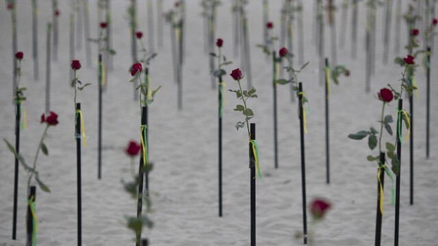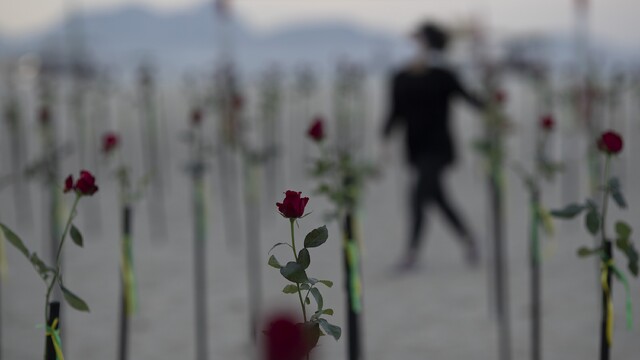 Brazílčania umiestňujú ruže na známej pláži Copacabana v Riu de Janeiro. Takýmto spôsobom si pripomínajú 500-tisíc obetí koronavírusu. Zároveň vyjadrujú protest proti vláde prezidenta Jaira Bolsonara a jej reakcii na koronavírusovú pandémiu.