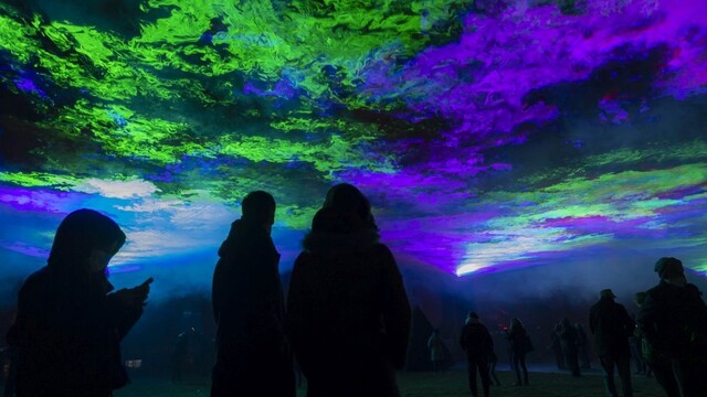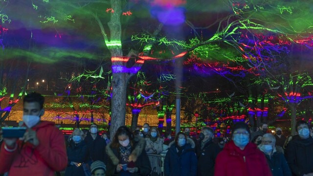 Ľudia sledovali zvukovú a svetelnú šou realizovanú švajčiarskym umelcom Danom Acherom s názvom Borealis počas osláv Nového roka v parc des Bastions v Ženeve vo Švajčiarsku
