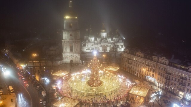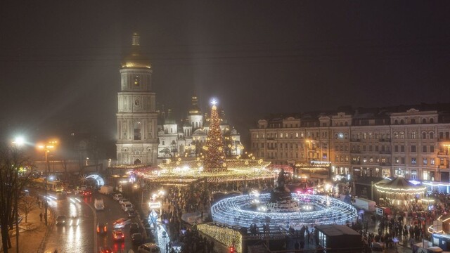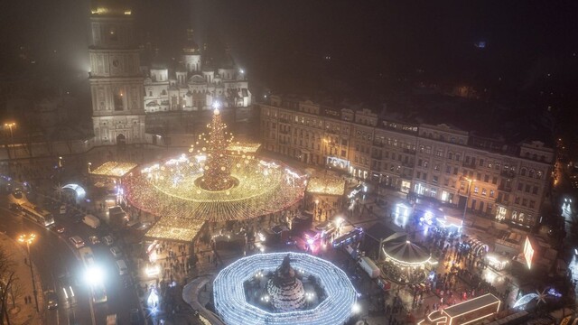 Davy ľudí oslavovali príchod Nového roka pri vianočnom stromčeku na sviatočnom trhu s Katedrálou sv. Sofie aj v Kyjeve na Ukrajine. Napriek karanténnym obmedzeniam Ukrajinci ignorovali ochranné opatrenia.