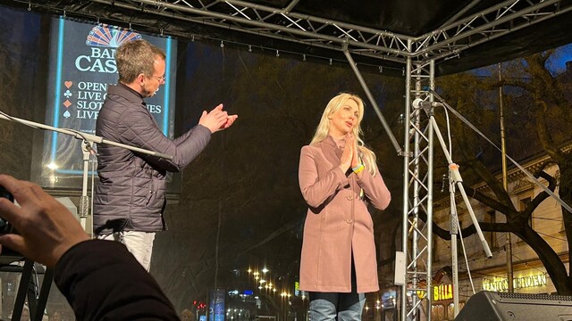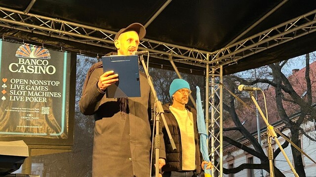 17:45 "Ste úžasní ľudia s veľkým srdcom. Zachránite naše deti pred vojnou," vyhlásila speváčka z Ukrajiny. Námestím SNP sa nesie zvuk slovensko-ukrajinského duetu.