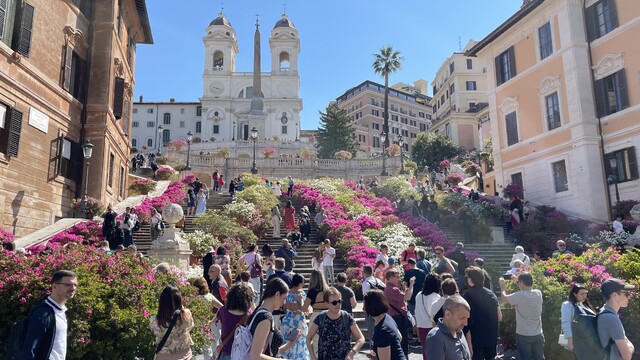 Metrom sme sa dopravili na stanicu Spagna, kde je známe Španielske námestie a Španielske schody, ktoré vedú k chrámu zasvätenému Svätej Trojici, Trinita dei Monti. Schody sú prísne strážené. Nie je možné si na ne sadnúť! Policajt vám pohrozí alebo uloží poriadkovú pokutu. Cesta k chrámu po schodoch vedie pomedzi závoje kvetov, čo dodáva celému miestu rozprávkový nádych. Na všetky pamiatky odporúčame chodiť skoro ráno alebo neskôr večer práve pre veľké davy ľudí, ktoré si pamiatky počas dňa obzerajú.