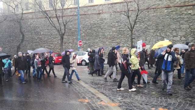 12:15 Medzi učiteľmi je v dave aj veľký počet študentov. Svojich učiteľov prišli podporiť napriek chladnému počasiu a dažďu. Učitelia zatiaľ zdôrazňovali najmä podporu ľudí, za ktorú ďakujú.