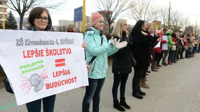 Učitelia, ktorí sa zapojili do štrajku, vytvorili živú reťaz aj pred košickým magistrátom. Podporiť ich prišli i rodičia a sympatizanti. "Je to celoslovenská akcia. Snažíme sa ukázať nejakým spôsobom nielen učiteľskej verejnosti, ale aj rodičom, aby sme spoločne tento boj zvíťazili," uviedol organizátor podujatia Juraj Kolesár z Iniciatívy slovenských učiteľov.