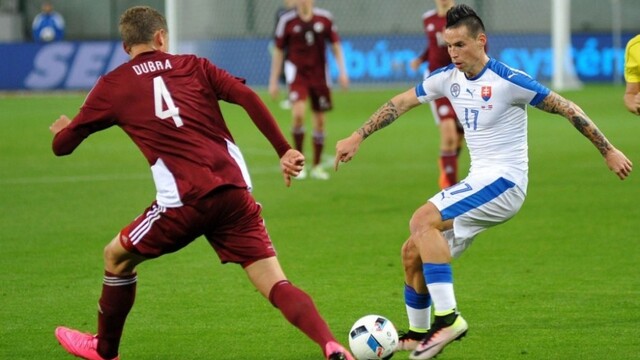 Najväčšie príležitosti na otvorenie skóre mali v druhom dejstve stredopoliari Vladimír Weiss a Marek Hamšík, ale s ich peknými strelami si poradil hosťujúci brankár Andris Vanins. Výkopu na Štadióne Antona Malatinského predchádzala minúta ticha na počesť obetí bombových útokov v belgickej metropole Brusel i odovzdanie šeku na 15 000 eur Mariánovi Čišovskému od Slovenského futbalového zväzu a Internacionálov Slovenska.