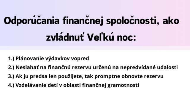 "Veľkonočné sviatky sú obdobím radosti a osláv, no nezabudnite, že aj pri prípravách na ne je dôležité mať pod kontrolou svoje financie," dodala Trogová.