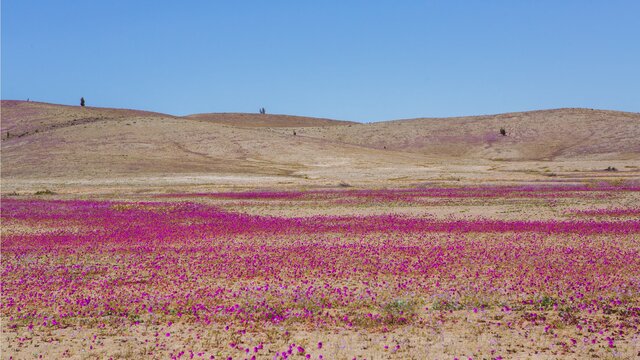 Menšia je aj rozmanitosť kvetov. Tento rok prevažuje miestna rastlina z čeľade zdrojovkovitých Cistanthe grandiflor, ktorá má charakteristickú fialovú farbu a na rast potrebuje veľmi málo vody.
