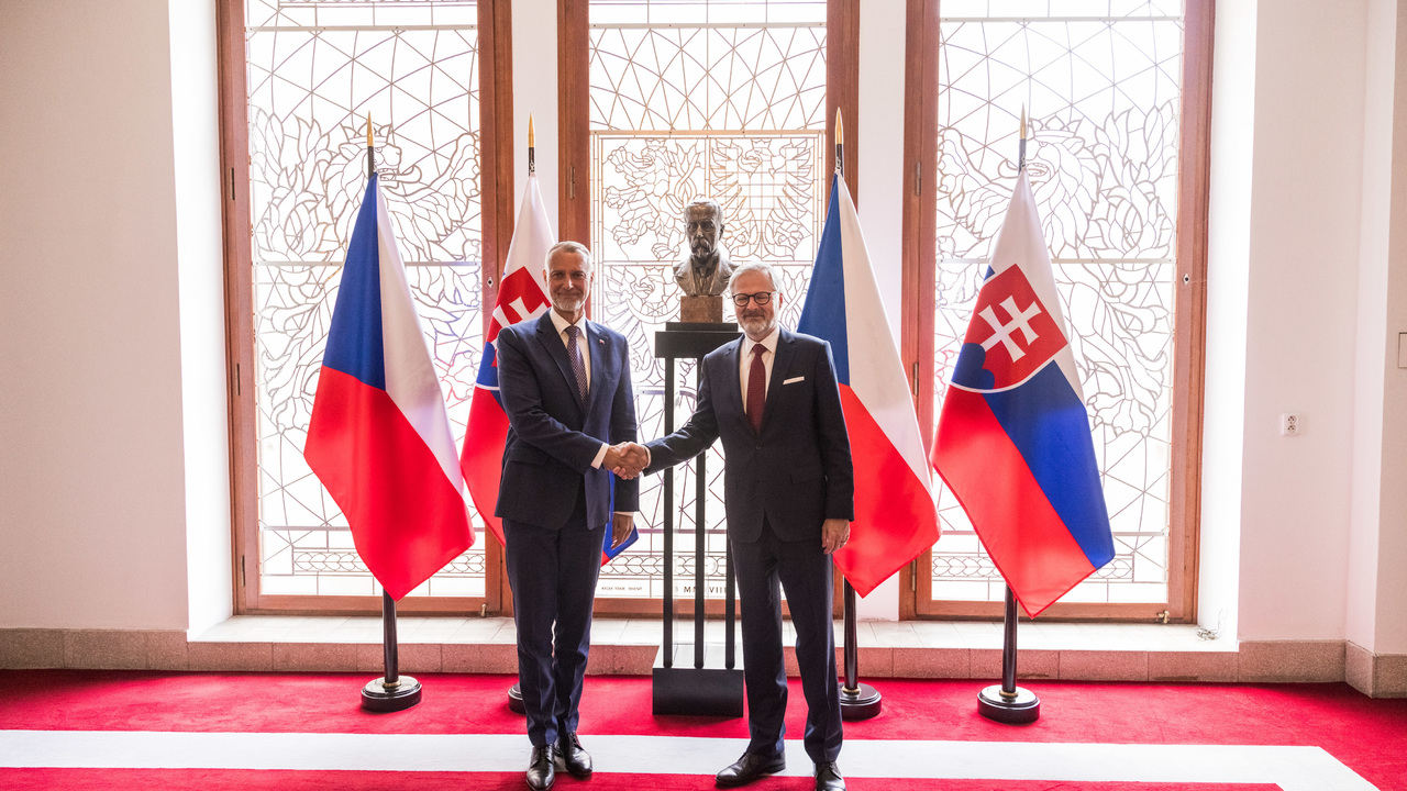 Predseda Národnej rady Richard Raši a český premiér Petr Fiala rokujú počas stretnutia v Prahe.