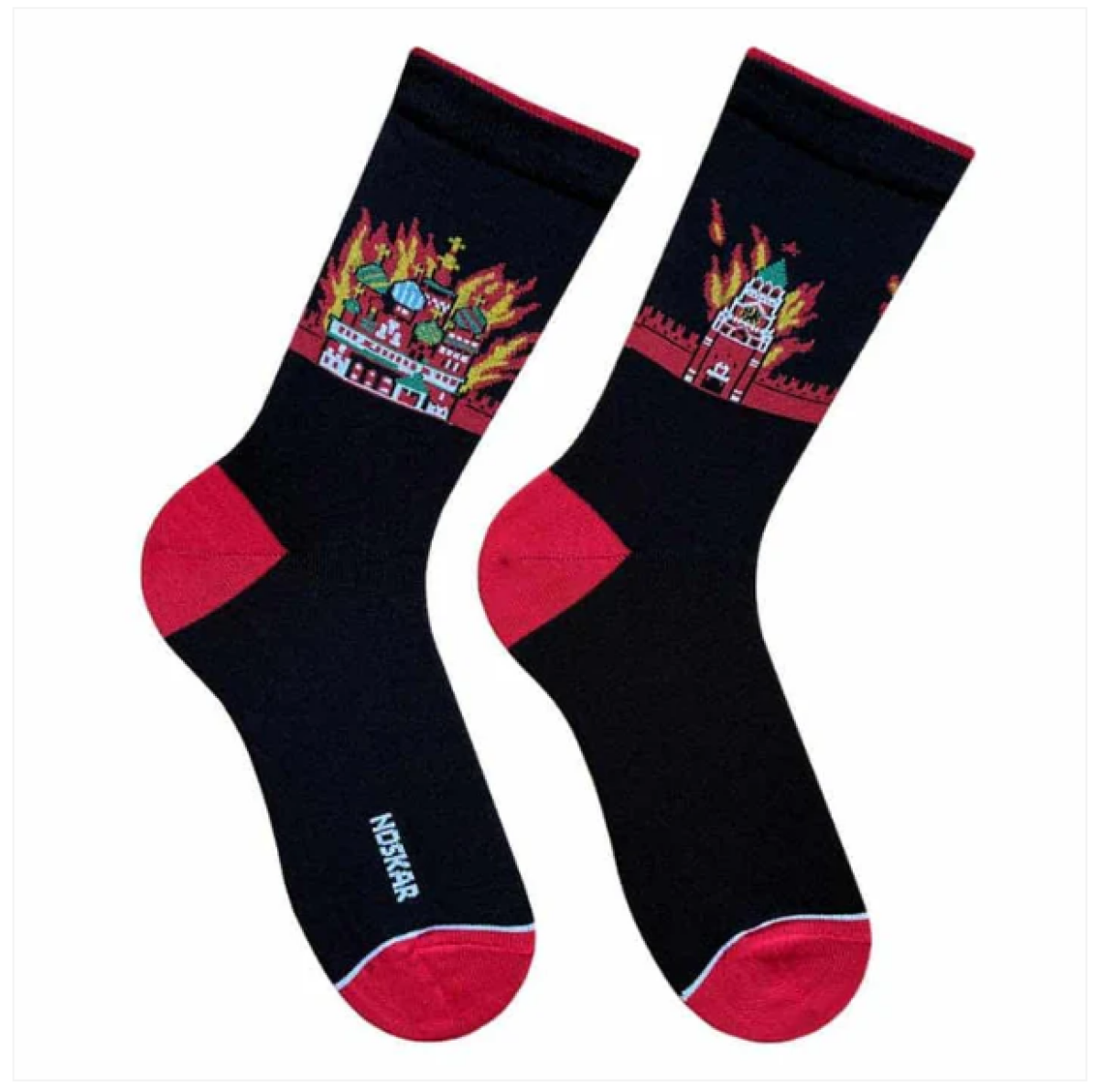 Ponožky s vyobrazením horiacej Moskvy predáva ukrajinský výrobca Noskar so sídlom v Dánsku.