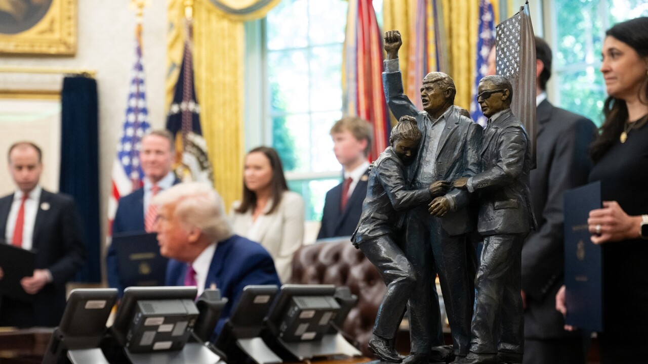V Oválnej pracovni Bieleho domu sa objavil nový prírastok – soška, ktorá zobrazuje chvíle bezprostredne po atentáte na Donalda Trumpa počas jeho predvolebného mítingu v americkom štáte Pensylvánia.
